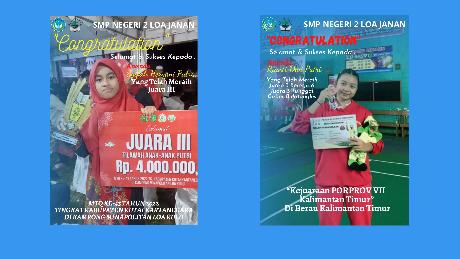 Kami mengucapkan selamat dan sukses atas prestasinya, semoga ke depan selalu sukses di bidangnya masing-masing. Dan semoga bisa menjadi inspirasi bagi siswa SMPN Loa Janan yang lain untuk bisa berprestasi juga. (Admin.)